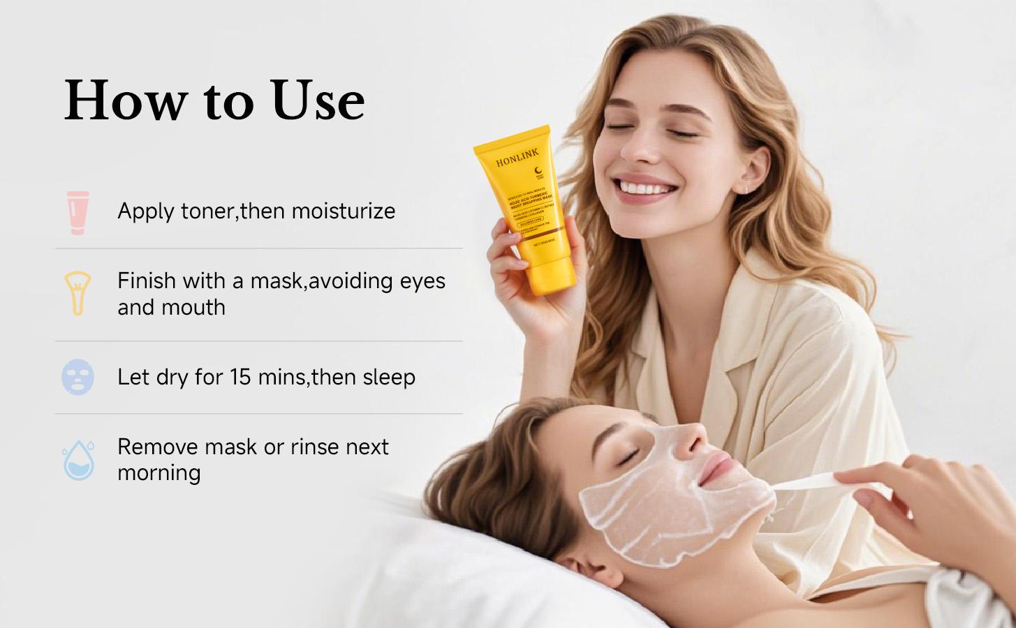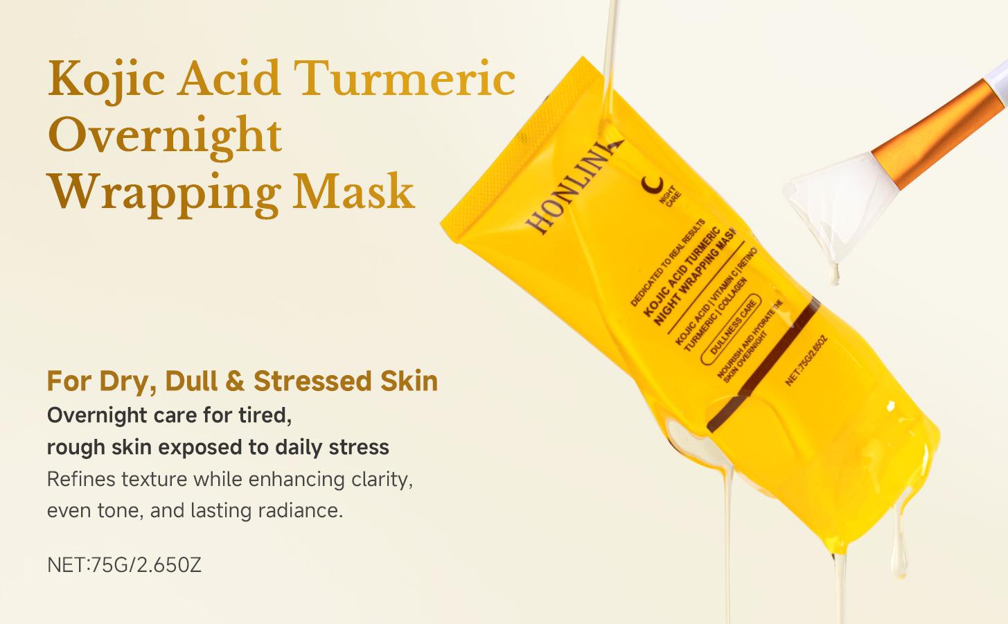 Proven Results -Clinical trials reveal remarkable improvements with Honglink Kojic Acid Turmeric Night Wrapping Mask: +6.8% enhancement in skin texture after single use, 24.7% improvement in uneven skin tone after 3 days of use and +33% increase in skin radiance after a single application. (Results may vary depending on individual skin types.)